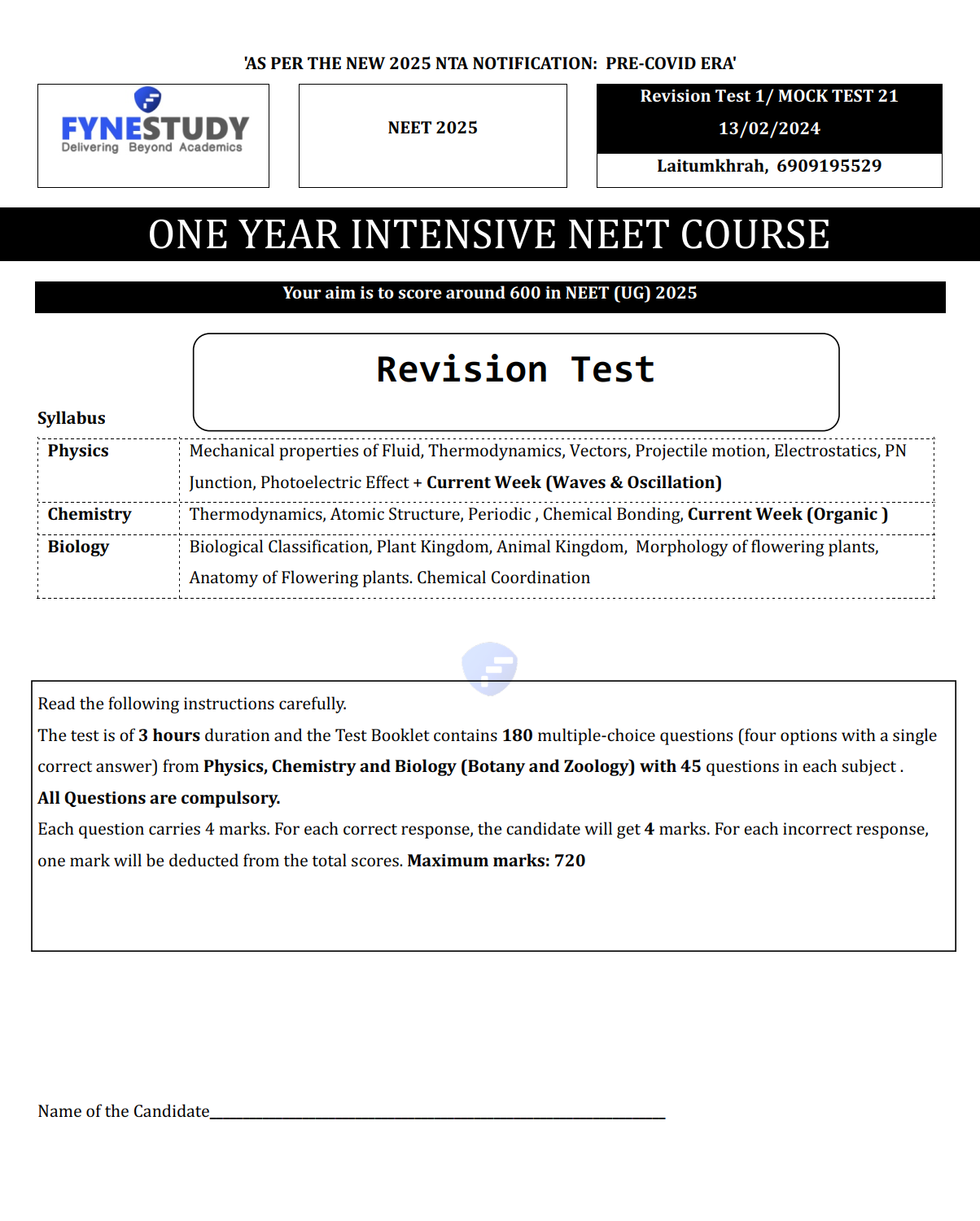 Fynestudy Intensive NEET Exam Series Test